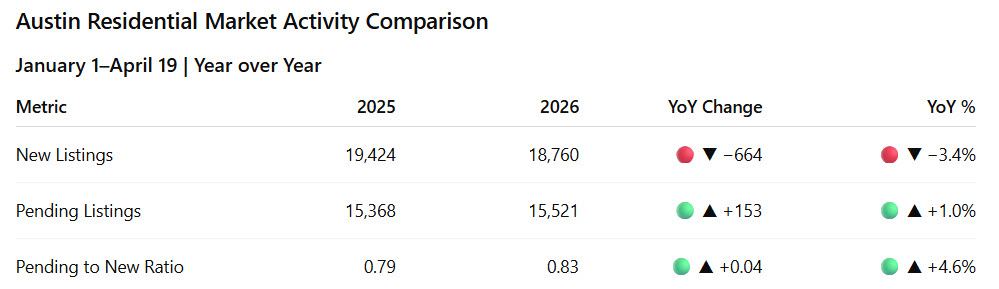 Austin residential (Jan 1–Apr 19): new listings are down 3.4% YoY, pending contracts are up 1.0% YoY, and absorption has improved to 0.83. Buyer demand continues to outpace supply compared to last year.